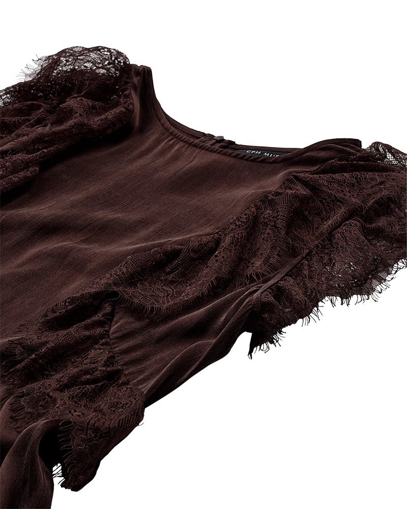 Lång klänning i ett premium cupro-material med volanger och fransar. Klänningen är kortare framtill med en dold dragkedja baktill samt tvådelade axelband som kan knäppas upp och stylas på olika sätt.