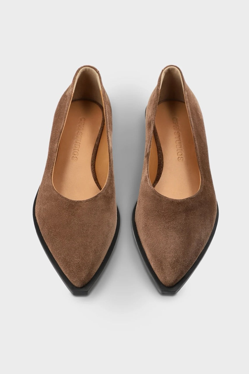 Dessa ballerinaskor i fin mocka har rena linjer och en spetsig tå. Den iögonfallande sulan med en lätt blockklack ger en elegant touch för vardagsbruk.