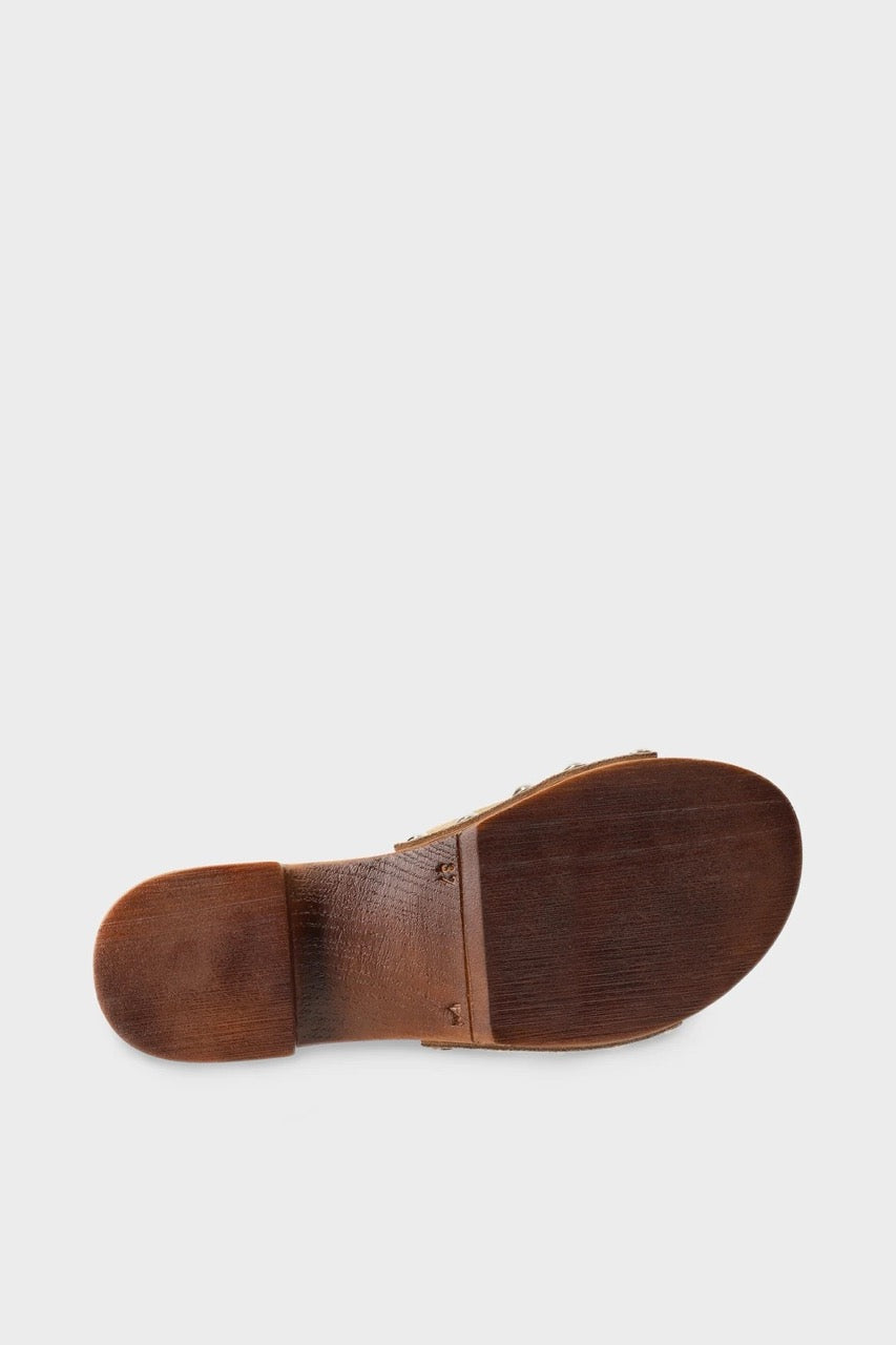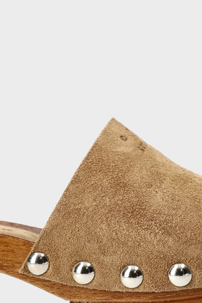 Moderna träskor i mjuk mocka (läder). Den distinkta träsulan med klack och öppen tå skapar en trendig look, medan den subtila logotypen på mockan och silvernibbar på sidan ger en touch av stil.