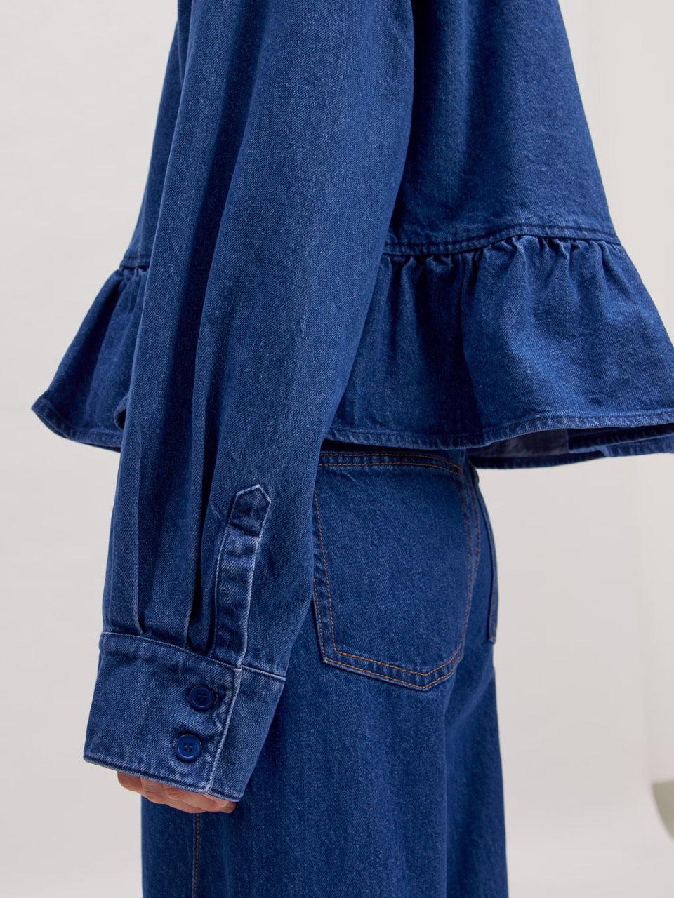 Kort denimtopp med dolda knappar framtill och peplumkant i nederkant. Toppen kan även bäras som jacka.