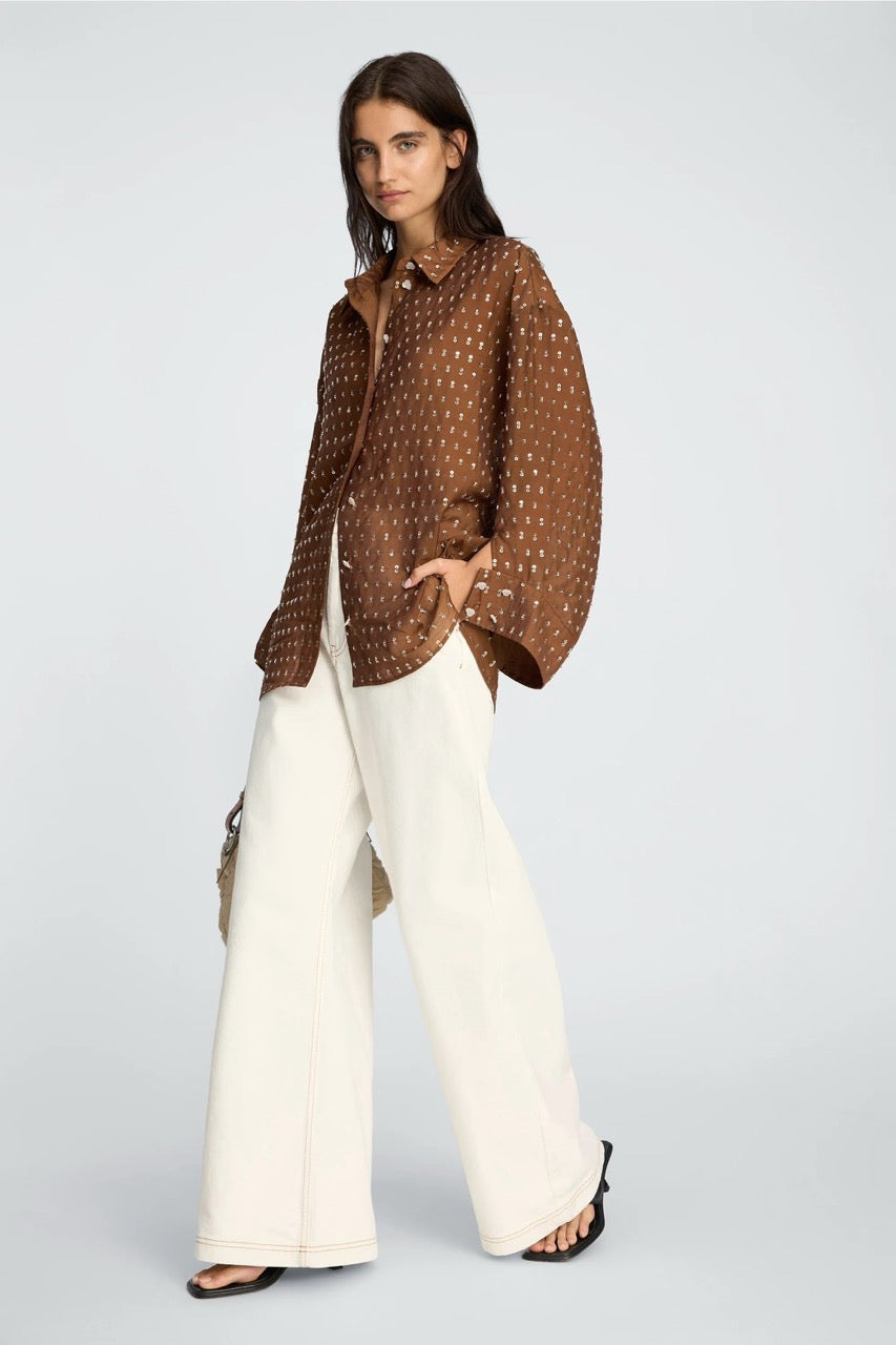 Skjorta med en överdimensionerad passform och diskreta paljettdetaljer. Den är designad med en klassisk krage, knäppning framtill och långa ärmar med breda manschetter.