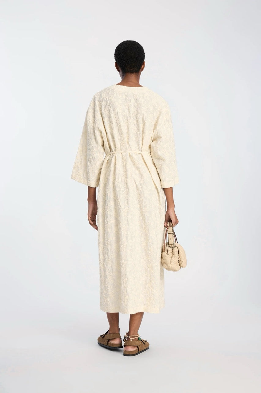 Midiklänning tillverkad av ett strukturerat jacquardtyg med subtila blommiga detaljer i olika toner. Modellen har V-ringning, vida ärmar och en rak silhuett, markerad i midjan med ett diskret knytband. Tillverkad i ett lätt vävt material med en mjukt texturerad yta.