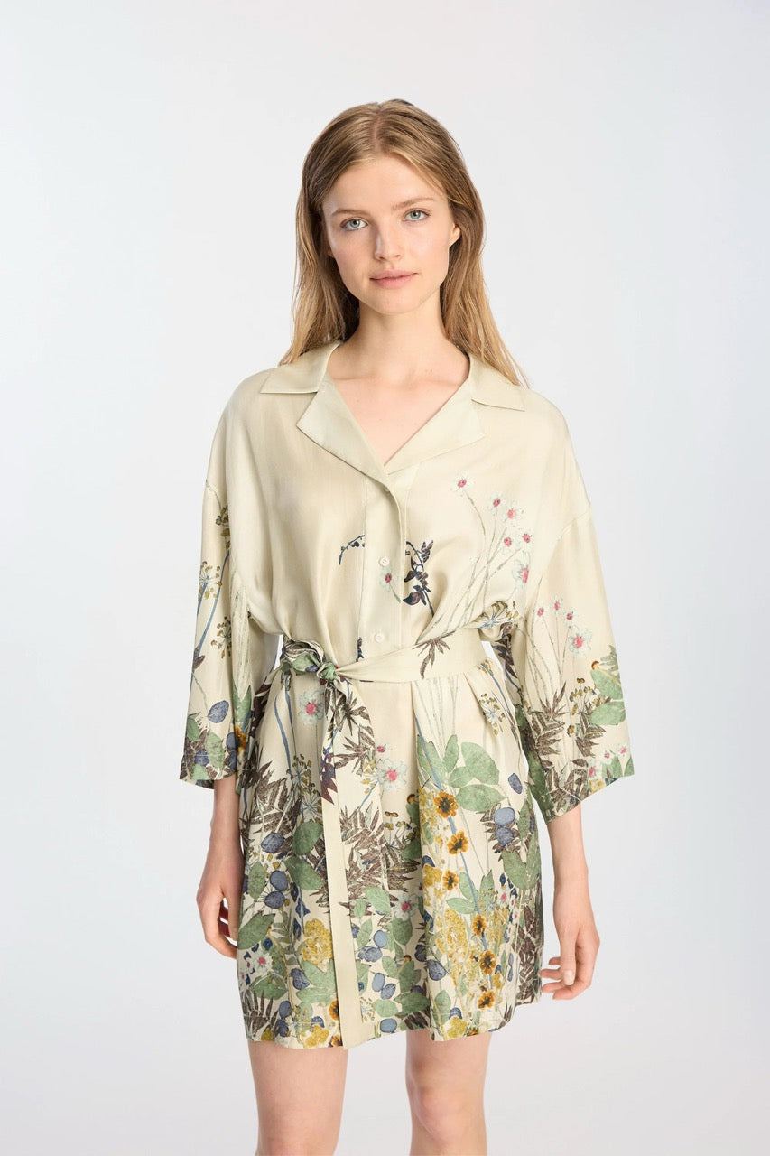 Klänning tillverkad i 100 % siden med ett botaniskt tryck i mjuka krämfärgade toner. Designad i en lös, kort silhuett med skjortkrage, korta ärmar och ett midjebälte.