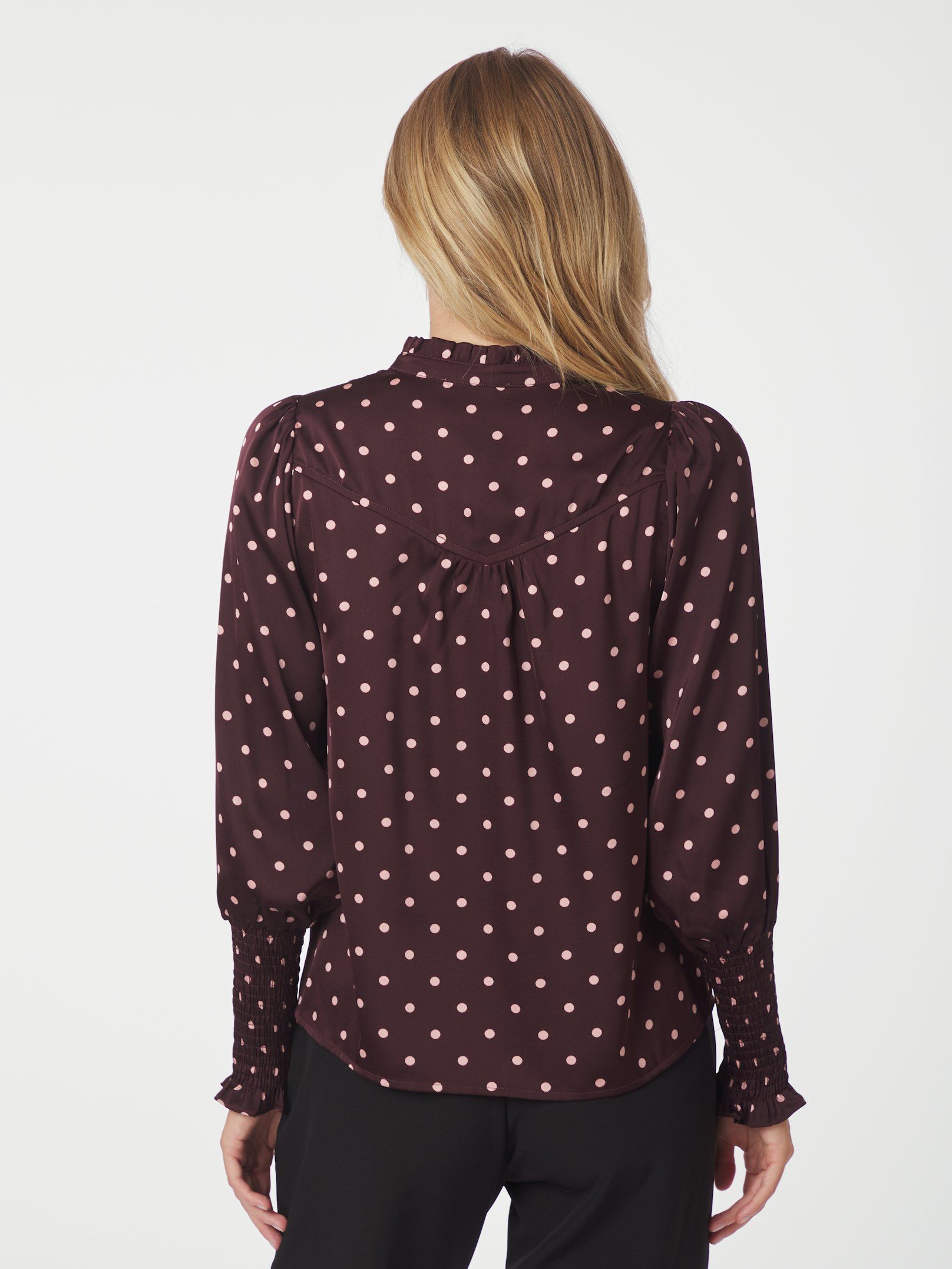 Feminint blus med långa ärmar. Blusen har ett smickrande prickmönster. Modellen är 176 cm lång och bär storlek 36.