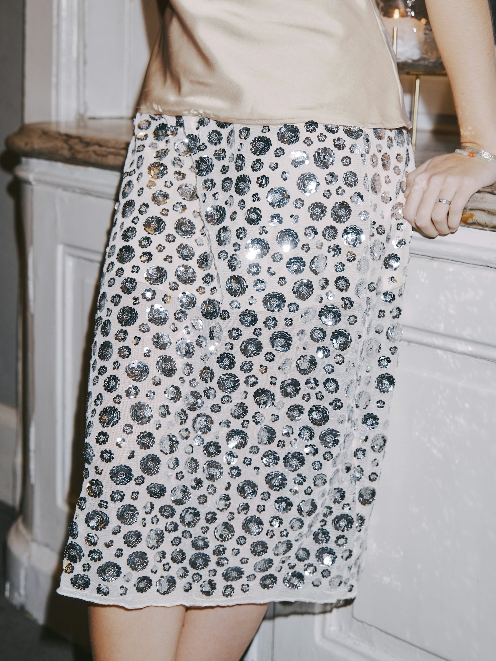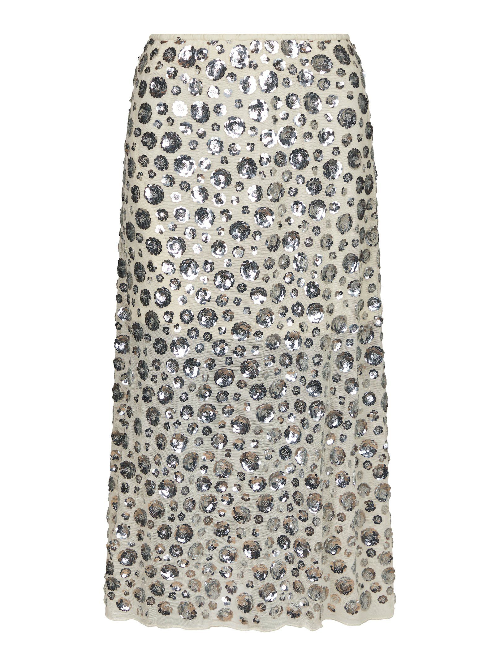 Kjol med en längd som når under knäet. Kjolen kommer i en vacker paljettkvalitet med blommor och har en elastisk midja. Modellen är 176 cm och bär storlek 36.