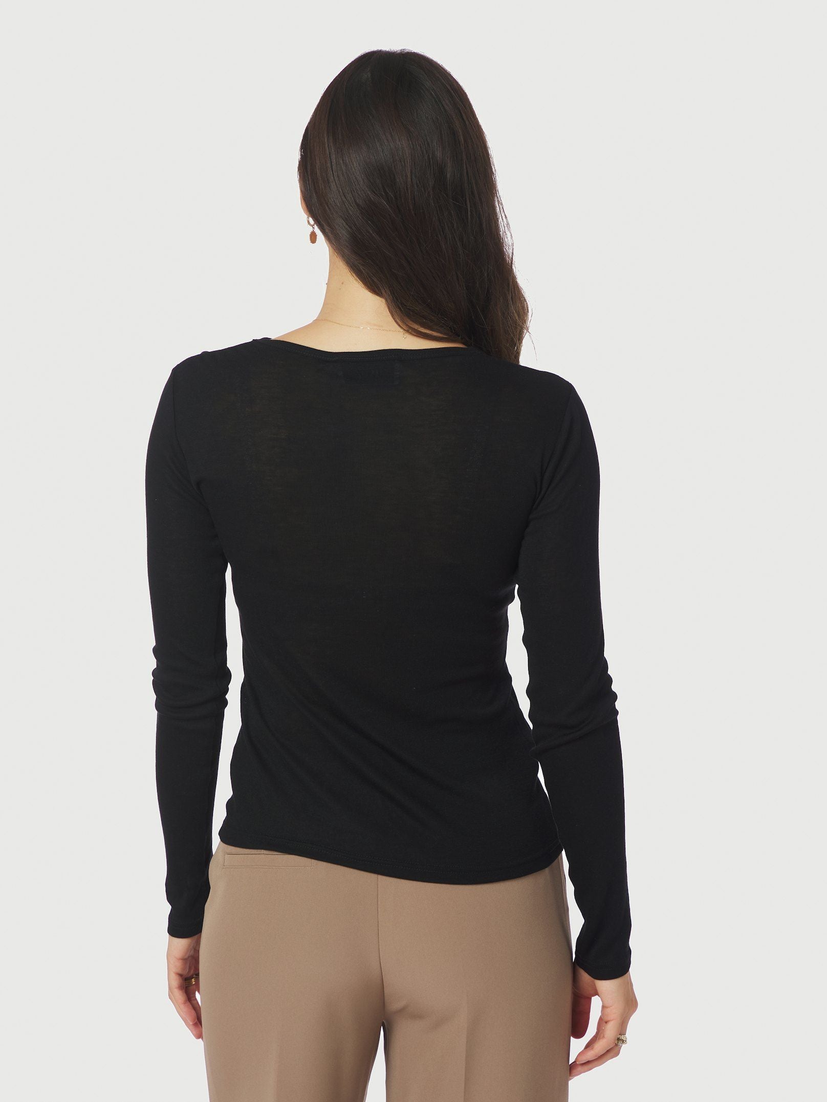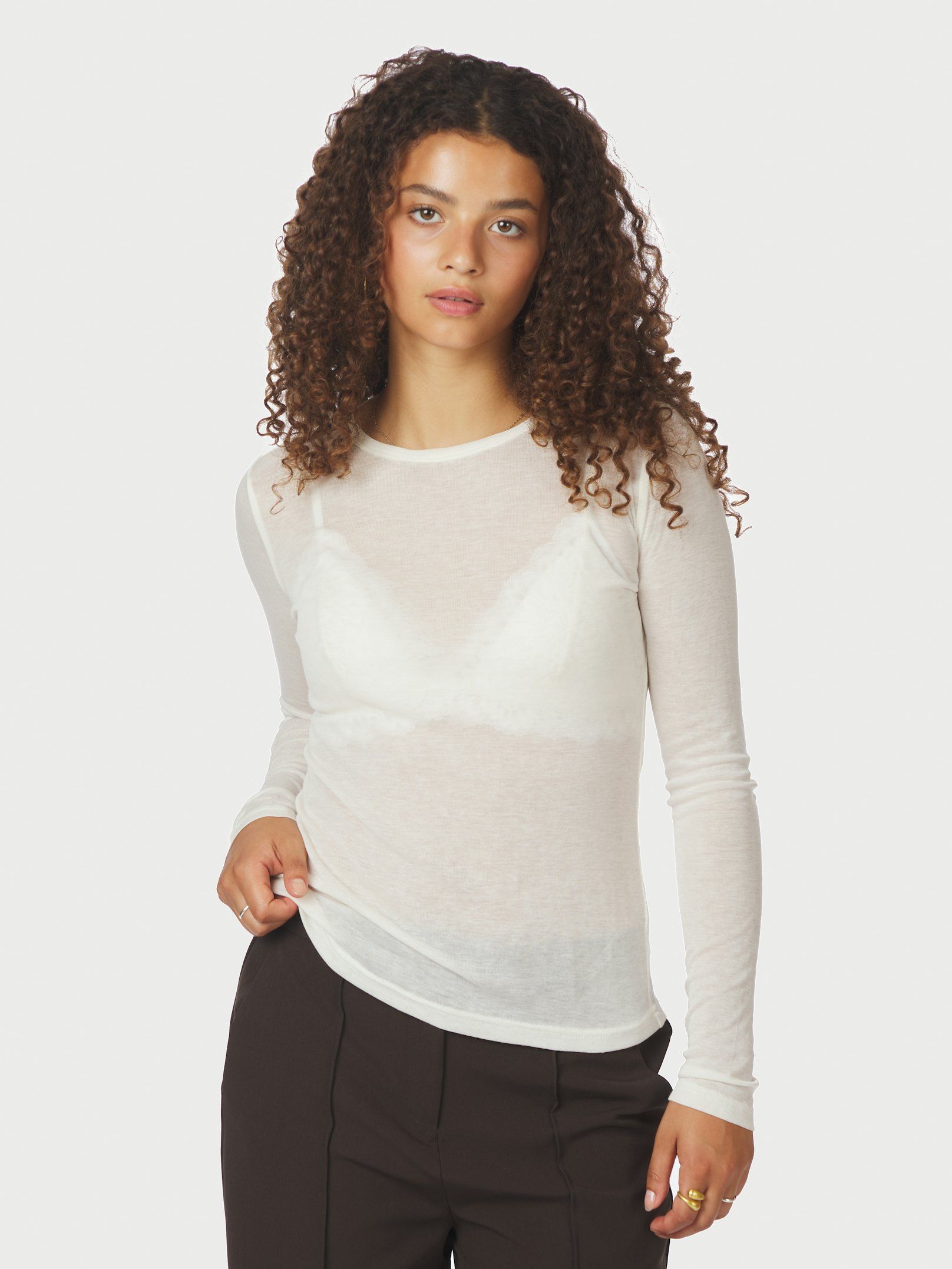 En tajt passande blus i fin ribbad kvalitet med rund hals. Kvaliteten är mjuk och lätt. Modellen är 176 cm lång och bär storlek 36.