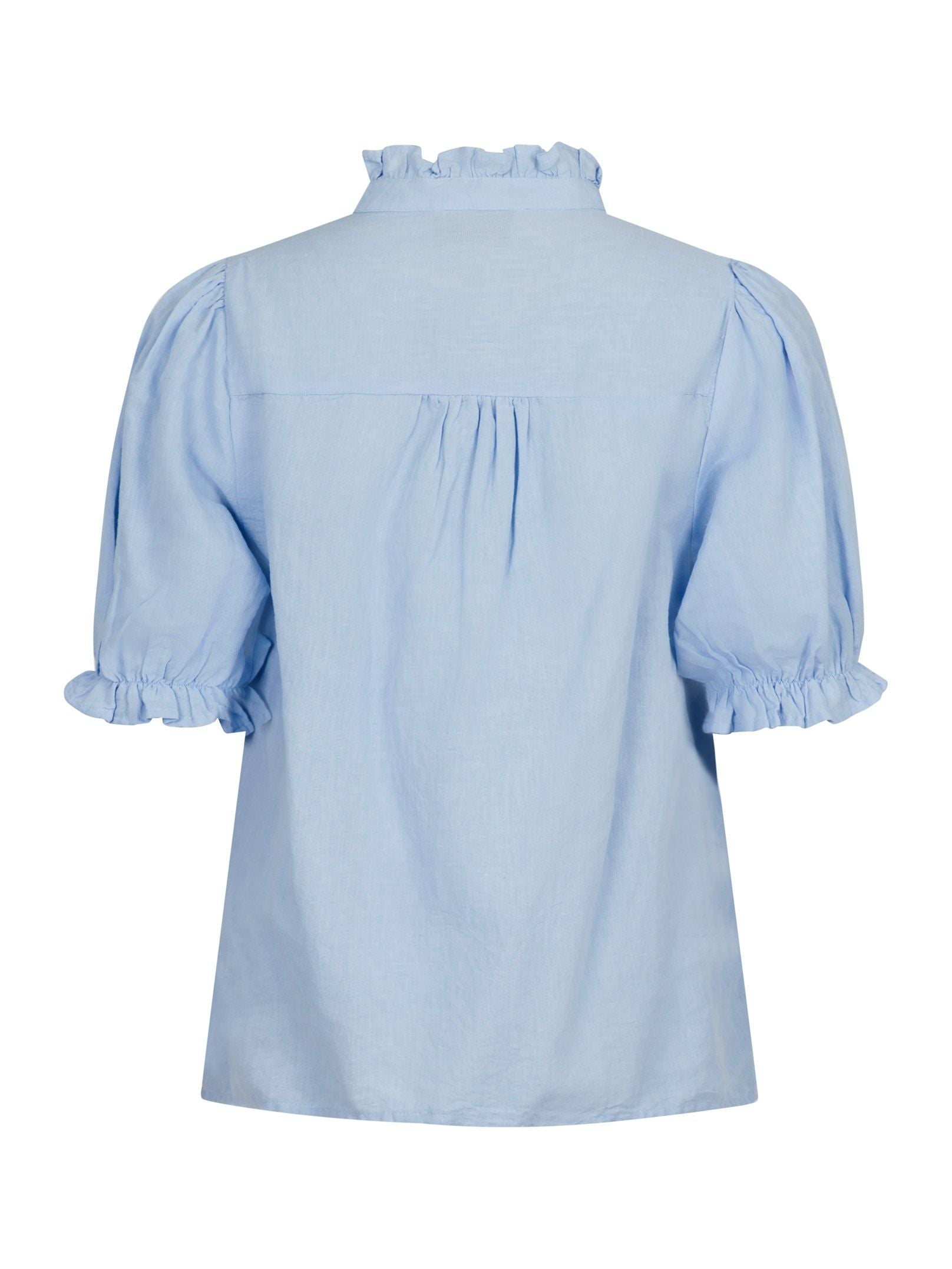 Kortärmad blus med fint volangdetalj vid kragen och axeln. Blusen har en öppning fram och puffdetalj vid ärmen.