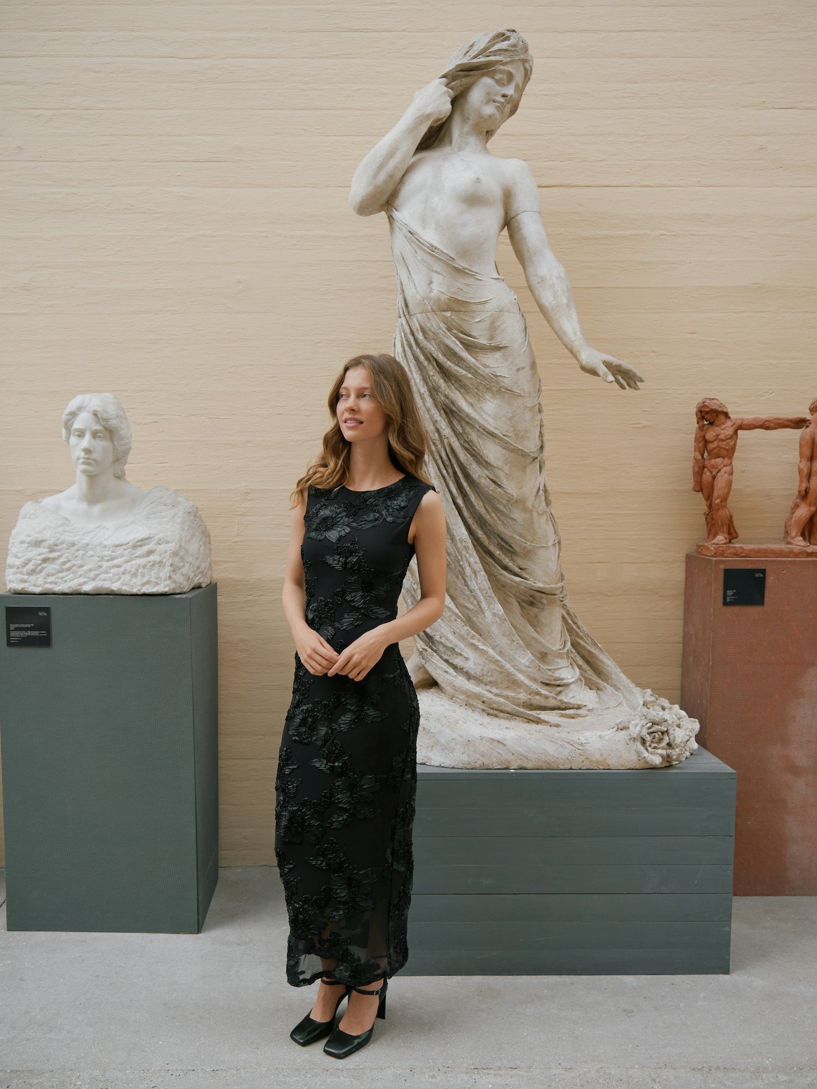 Vacker lång meshklänning i en 3D-blommeshkvalitet. Modellen är 176 cm lång och bär storlek 36.