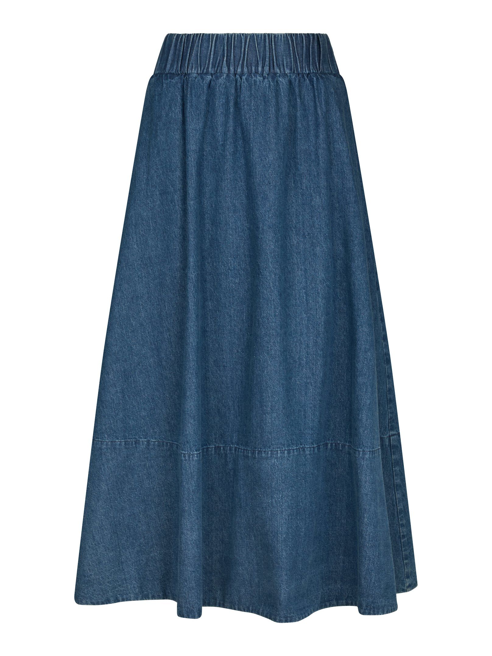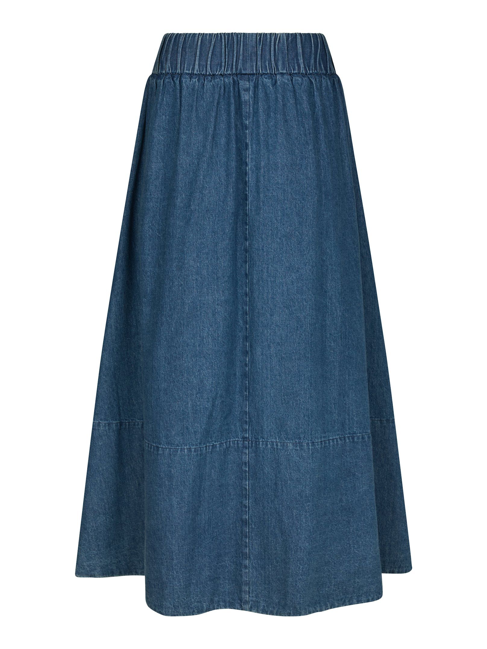 Midikjol i denimkvalitet. Kjolen har en hög midja och fickor i sidorna. Modellen är 176 cm lång och bär storlek 36.