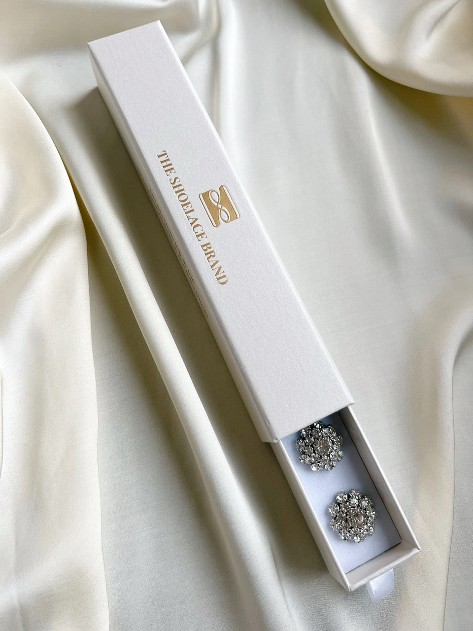Olivia är en blomformad knappsmycke med silverfärgad botten och klara kristaller som glittrar likt små diamanter.
