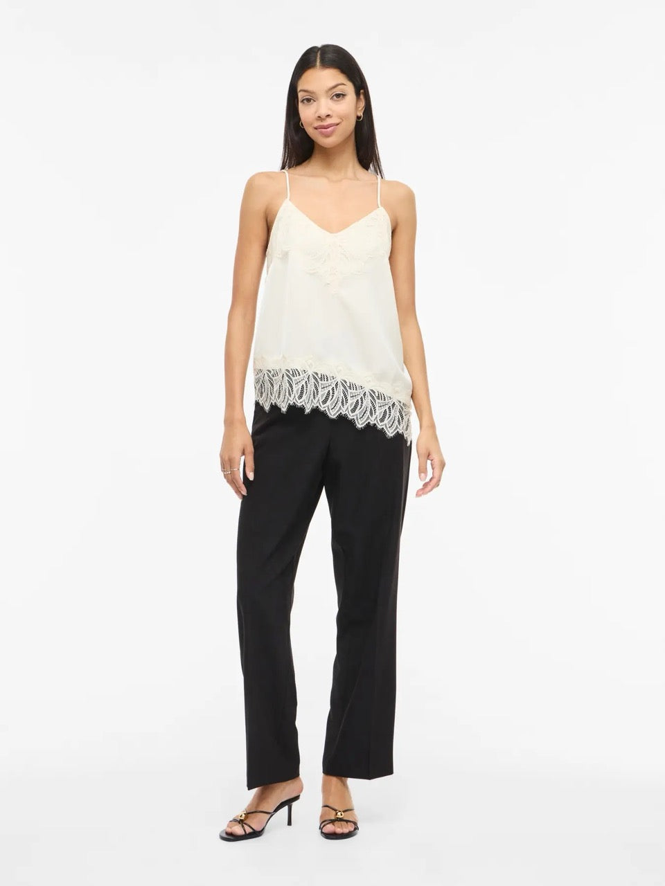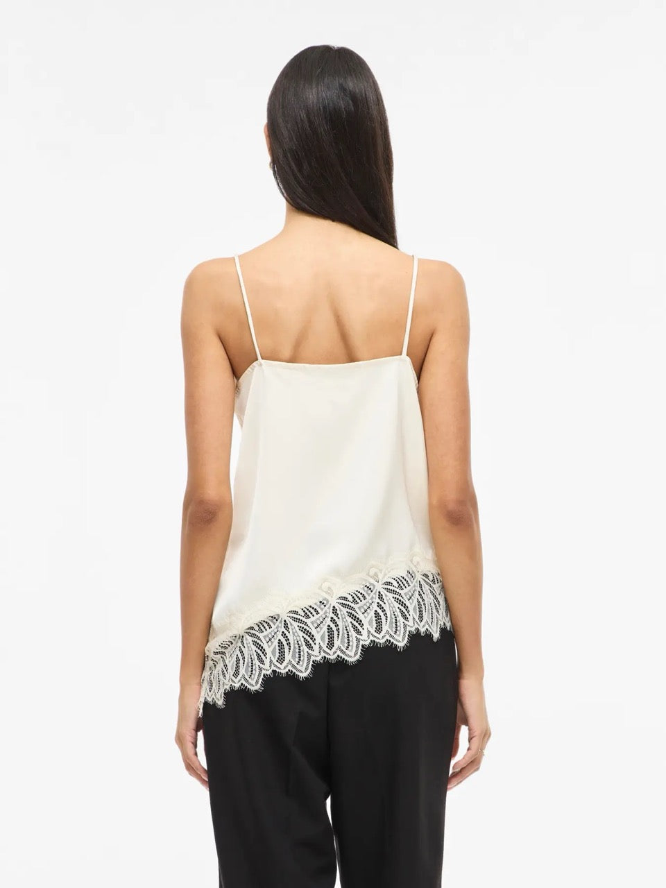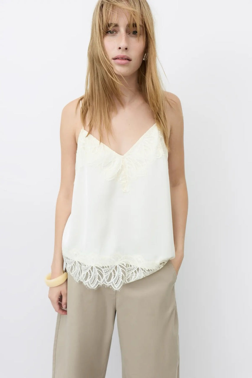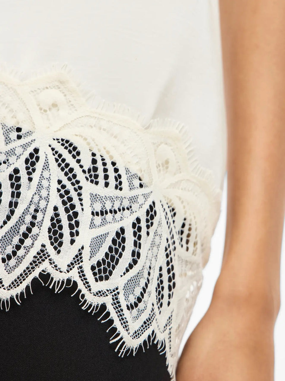 Asymmetrisk linneblus med spetsdetaljer på fållen